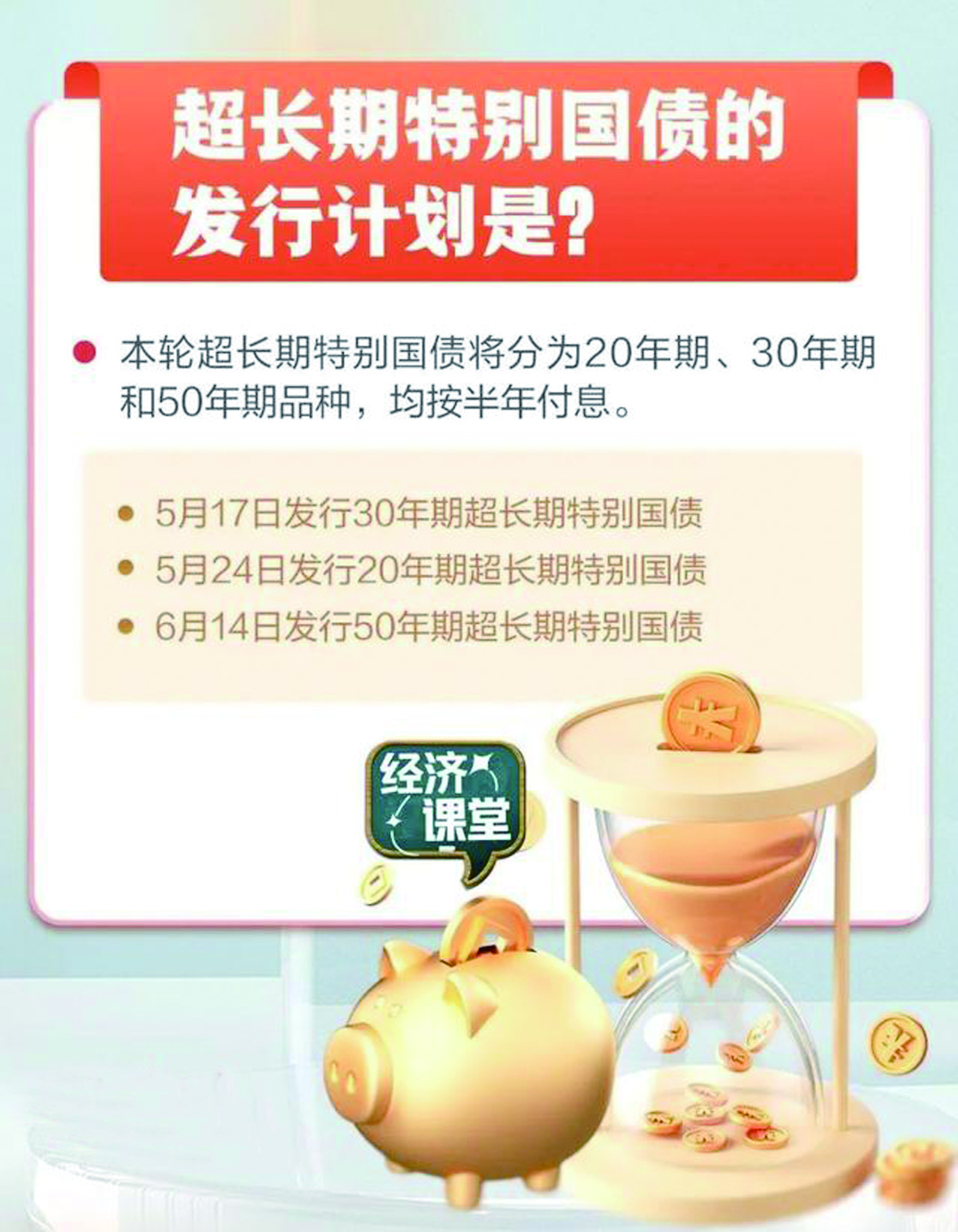 根据此次发布的通知,今年拟发行超长期特别国债的期限分别为20年、30年、50年,首次发行时间为5月17日,11月中旬发行完毕。