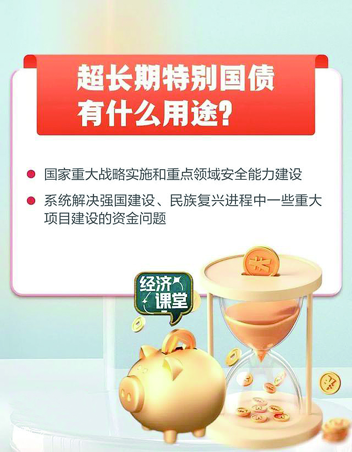 据国家发改委此前介绍,超长期特别国债将重点聚焦加快实现高水平科技自立自强、推进城乡融合发展、促进区域协调发展、提升粮食和能源资源安全保障能力、推动人口高质量发展、全面推进美丽中国建设等方面的重点任务。