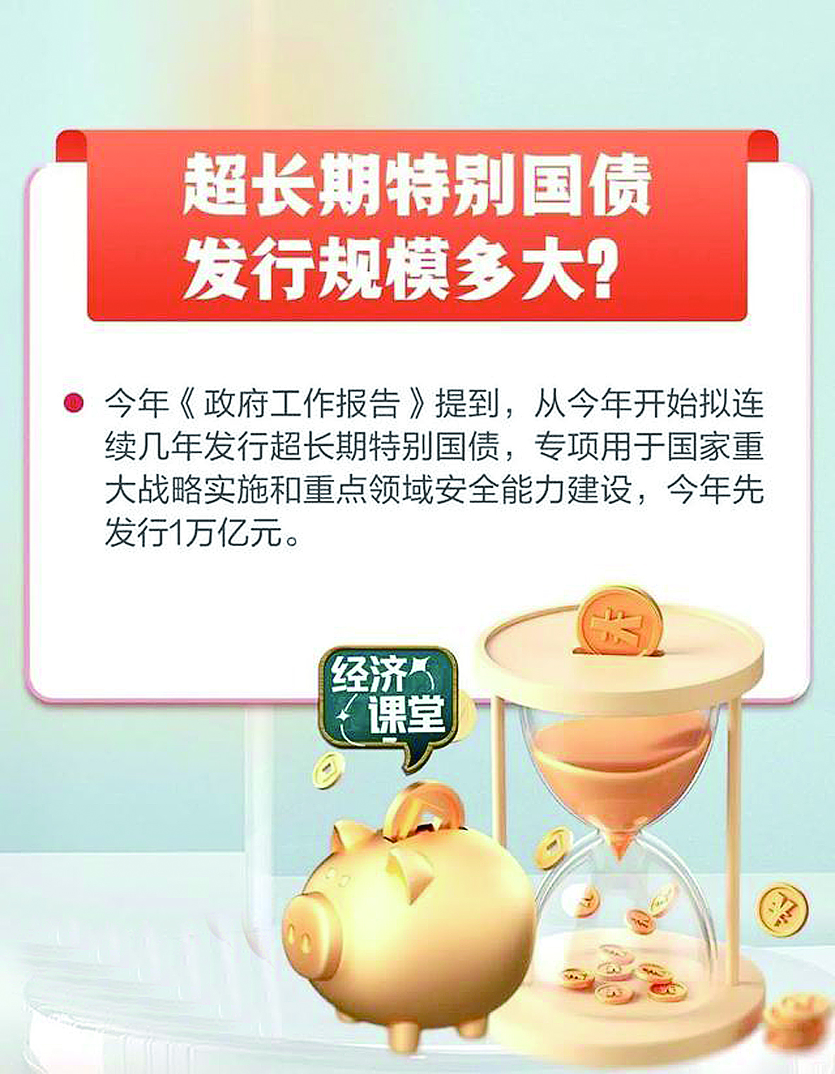 今年的政府工作报告提出,从今年开始拟连续几年发行超长期特别国债,专项用于国家重大战略实施和重点领域安全能力建设,今年先发行1万亿元。