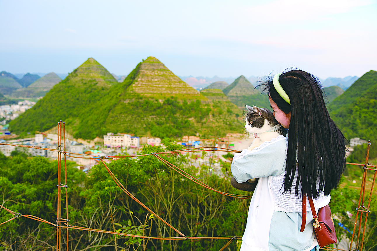 近日,在贵州省安龙县郊外的几座山体因形状酷似金字塔而引发关注。这些山体呈锥形,在结构上呈现出明显的层叠状。图为游客带着小猫观赏安龙县郊外形状酷似金字塔的山体(5月14日摄)。 新华社记者 刘续 摄