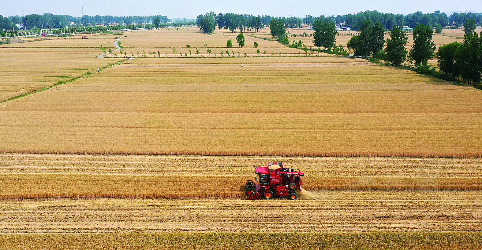 5月20日,大型收割机在河南驻马店市驿城区朱古洞乡的麦田里作业。 当日是小满节气,各地农民抢抓农时忙农事,田间地头一派繁忙景象。 新华社发