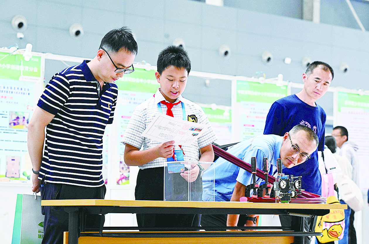 图为当日在第27届全国发明展览会现场,一名小朋友(左二)介绍自己的发明创造情况。 新华社发(陈其保 摄)