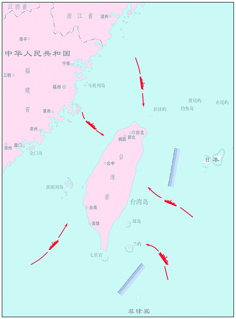 多方向抵近台岛战巡演练态势图。 东部战区 供图