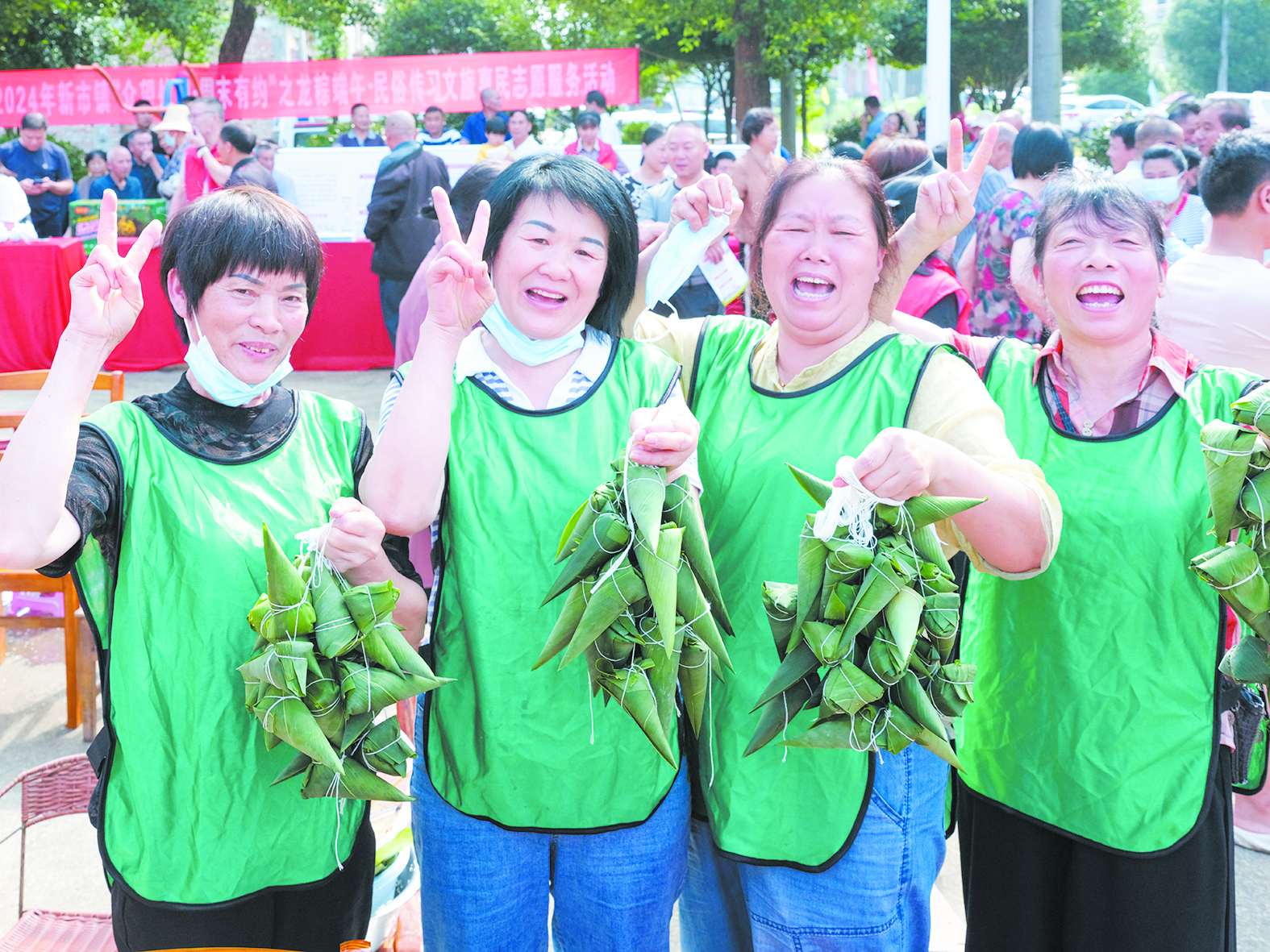“漏米啦!快帮我看看怎么绑!”卷粽叶、装馅料、缠细绳,参加比赛的村民铆足了劲,还是有人显得手忙脚乱,围观群众和志愿者在为他们加油呐喊,欢声笑语在广场传开。