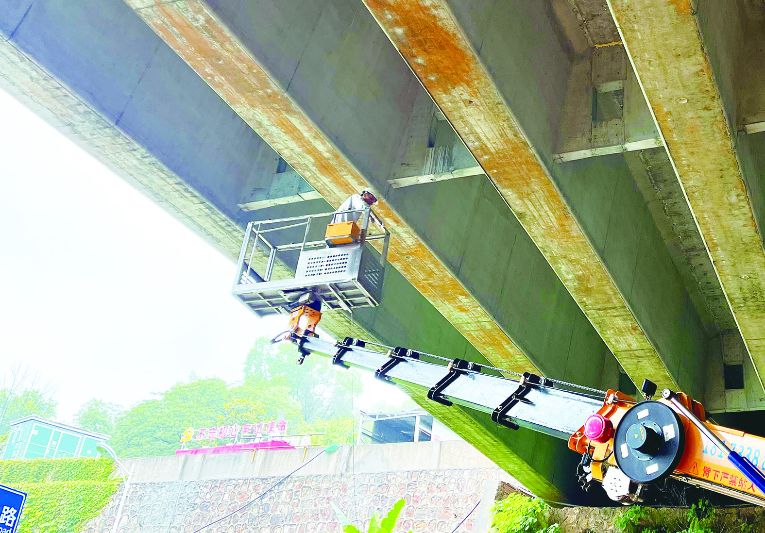 “滴滴滴……”一辆黄色工程车缓缓伸展长臂。2分钟后,这条长臂将工作人员送至15米高空,正好可触及桥梁底部。