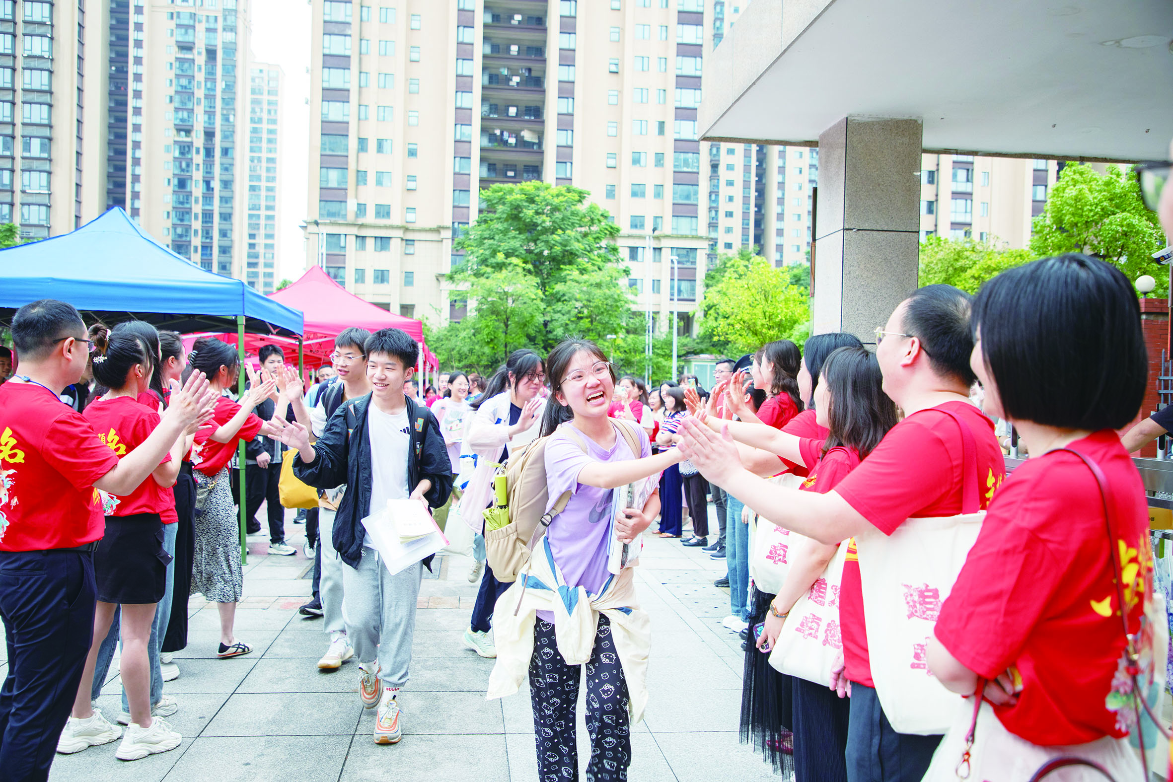 市二中初中部学生与老师击掌后步入考场。