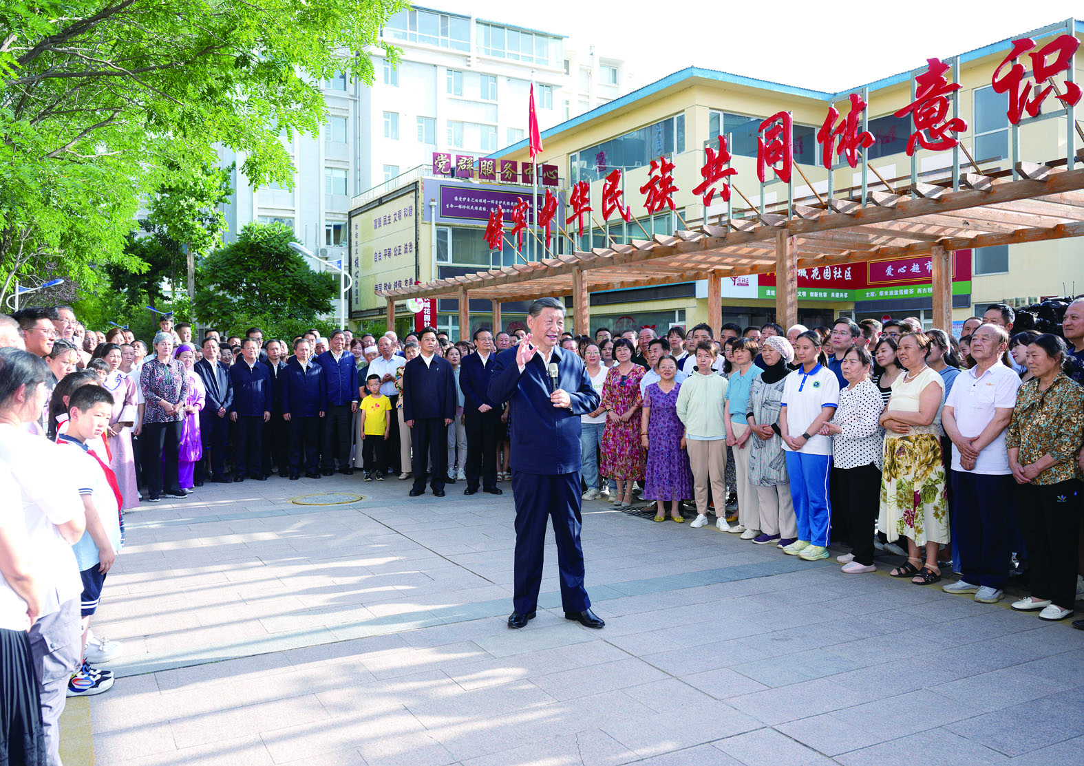 傍晚时分,社区广场十分热闹,居民们看见总书记来了,纷纷围拢过来,热烈鼓掌欢迎。习近平亲切地对大家说,时隔4年,我再次来宁夏看望各族干部群众,见到大家非常高兴!中华民族是一个大家庭,各族人民要像石榴籽一样紧紧抱在一起。要不断铸牢中华民族共同体意识,把各族人民的心紧紧连在一起,把各方面的力量广泛凝聚到一起,共同推进中国式现代化,共襄中华民族伟大复兴的盛举。