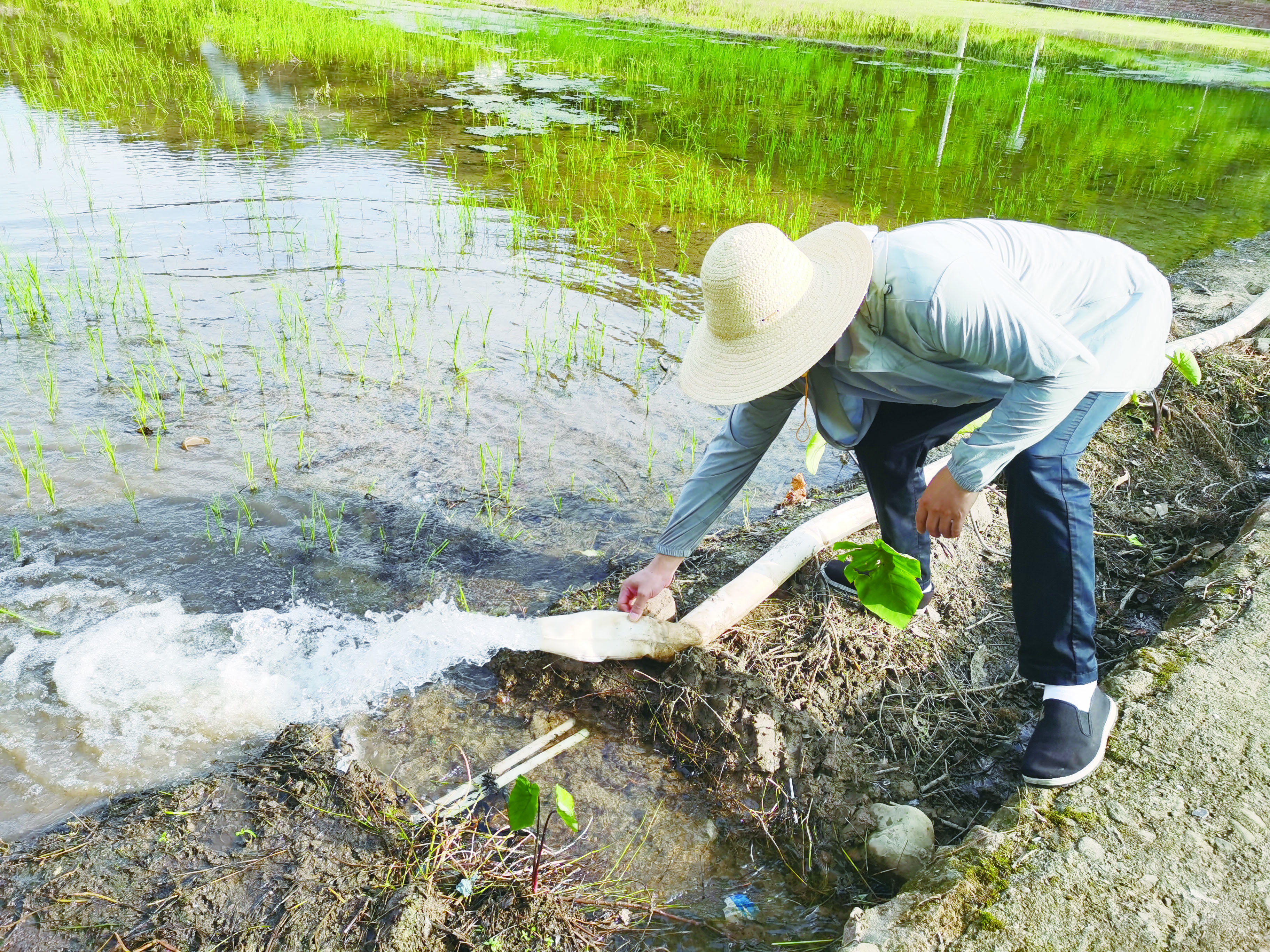村民潘大伯拖着一根长长的水管,将和平组送过来的水引入自家田地。不一会儿,清凉的水漫过开裂的土壤,干渴的水稻逐渐恢复气血。