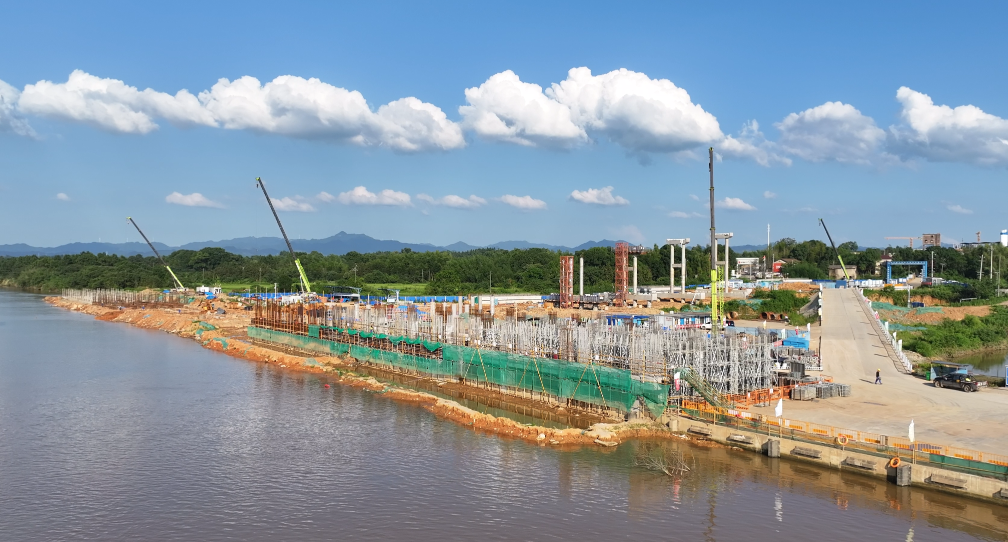 汛期湘江水位的上涨,给施工带来了极大挑战。6月底的洪水,就淹没了码头的部分施工区域。