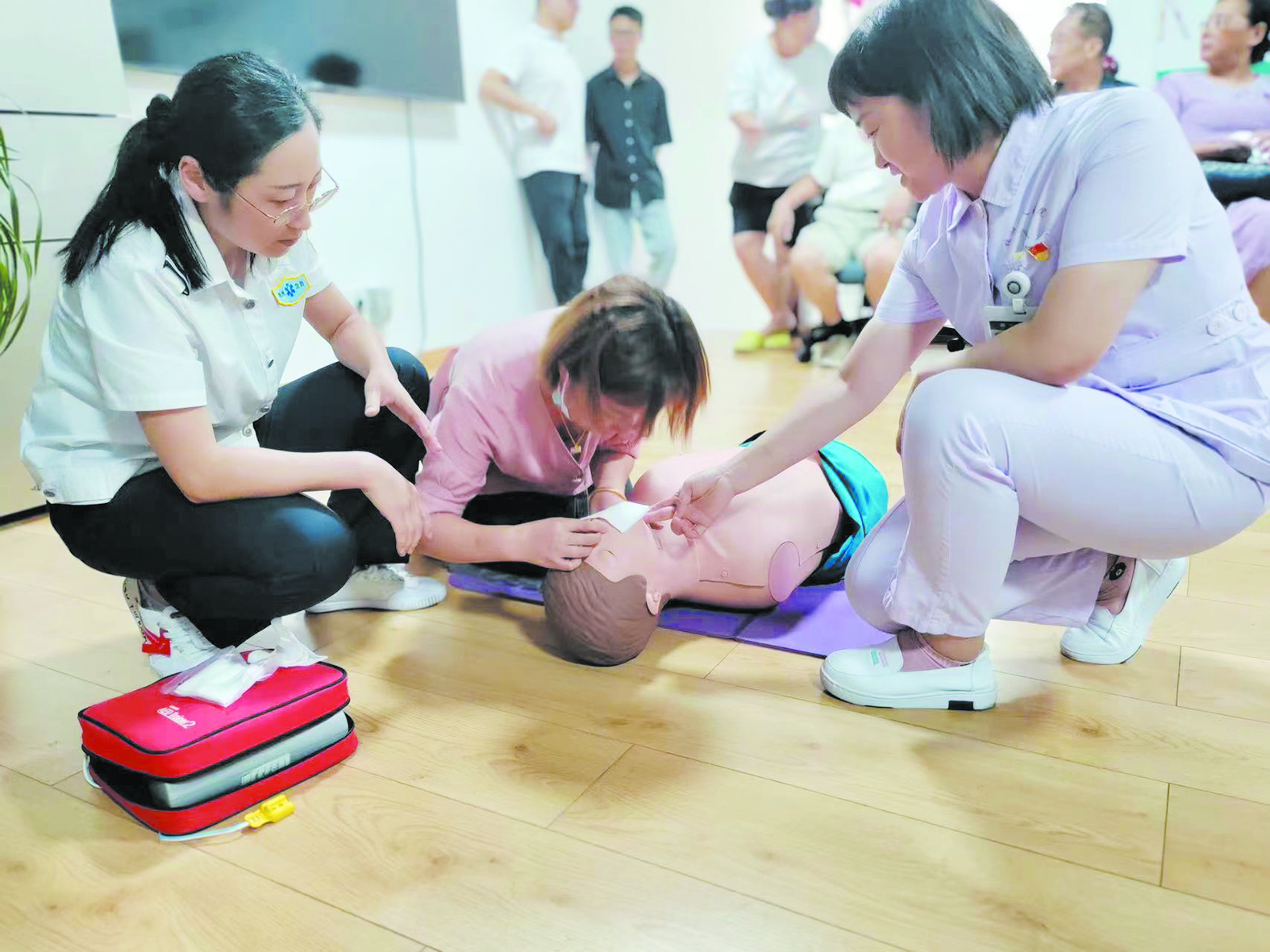 此次活动采取“理论讲解+实际操作”相结合的方式进行。首先,医护人员以最常见的“心肺复苏”应急处理为切入点,讲解了在事故发生时如何抓住“黄金4分钟”的正确有效急救措施。接着,医护人员利用模拟人演示胸外心脏按压、人工呼吸等急救技能,参加者也在医生的指导下积极参与“实战”。最后,现场通过一问一答的互动环节将气氛推向了高潮,知识的火花在交流中碰撞,应急救护的理念深入人心。