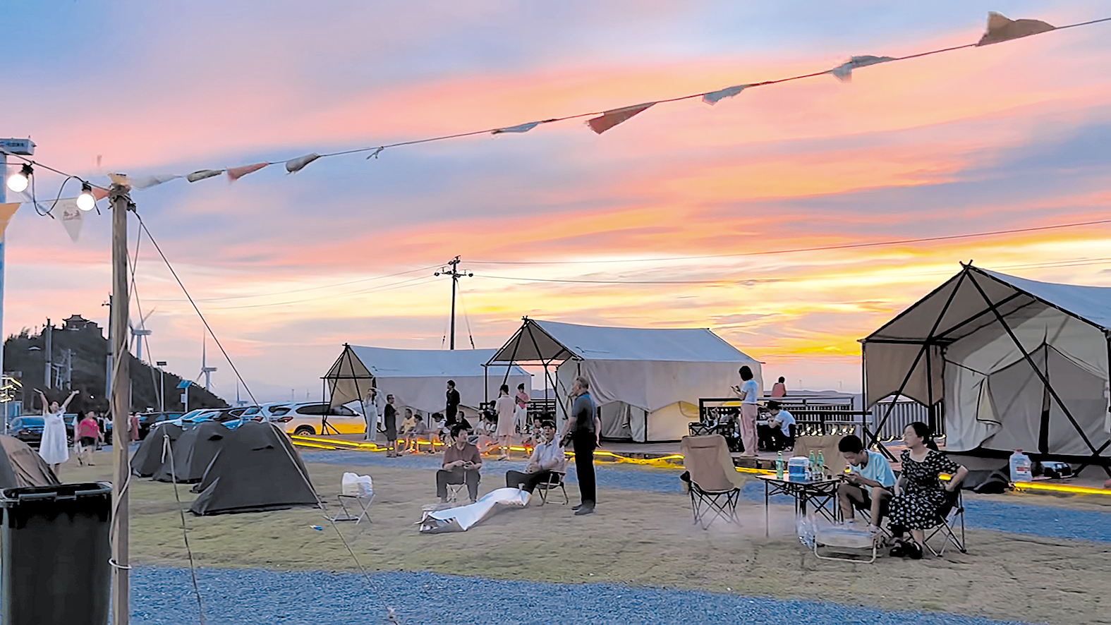 7月20日傍晚,位于渌口区龙潭镇龙潭村的蓬源仙,山峦起伏、楠竹青翠,沿着山脊有序排布的巨型白色风车悠悠转动,仿佛在向人打招呼,橘色的晚霞渐渐铺满天空,晕染出油画的味道。风车脚下的3387露营基地,串灯闪烁,彩旗飘动。草地上,游客早已支起各式各样的天幕、帐篷,和家人朋友喝啤酒、吃烧烤。进山道路上,依然有不少游客驾车前来,准备享受一场山野间的派对。