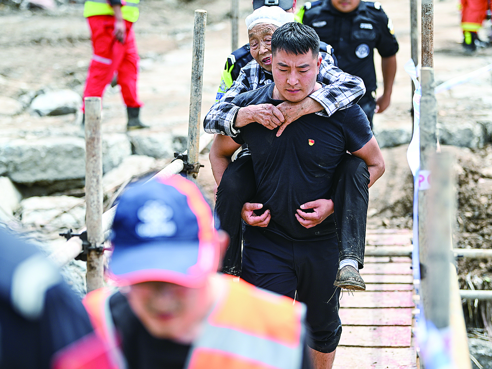 7月21日,在四川省雅安市汉源县马烈乡新华村,救援人员在转移受灾群众。 新华社发