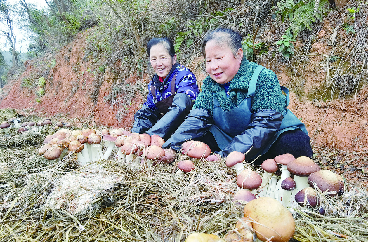 田家湾村村民在采摘红松茸。 记者/邹怡敏 摄
