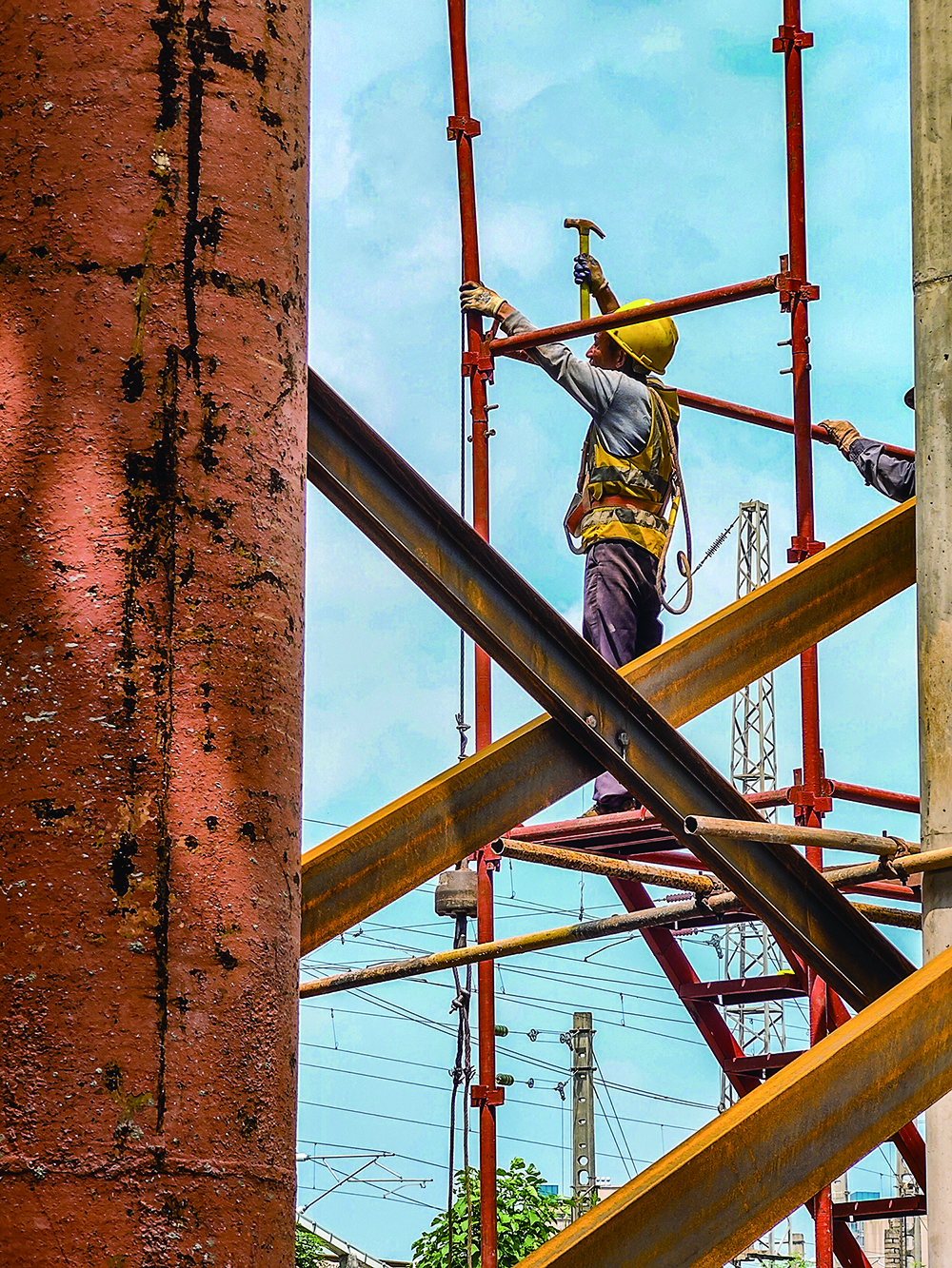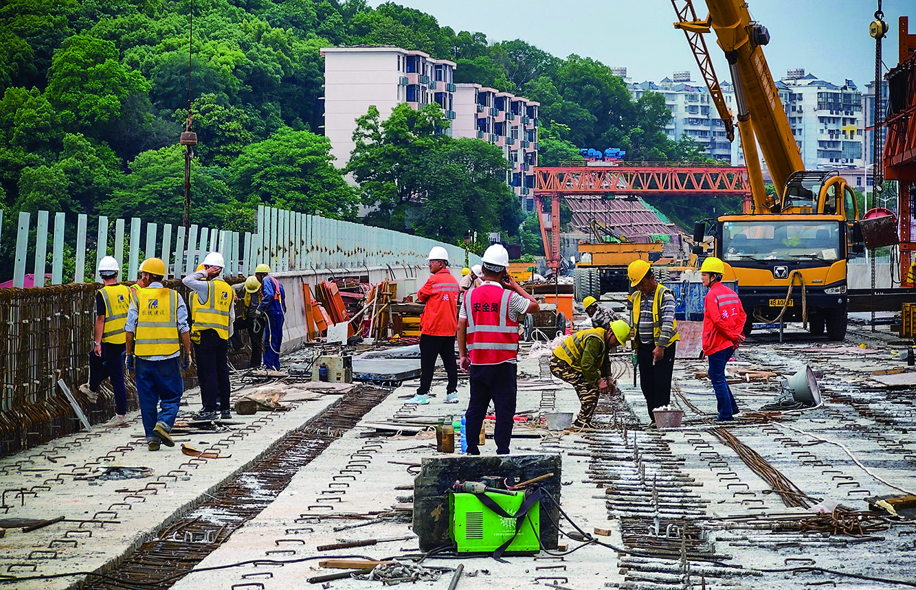 2023年7月24日,在第三跨立柱施工场地,工人冒着高温在高空作业。