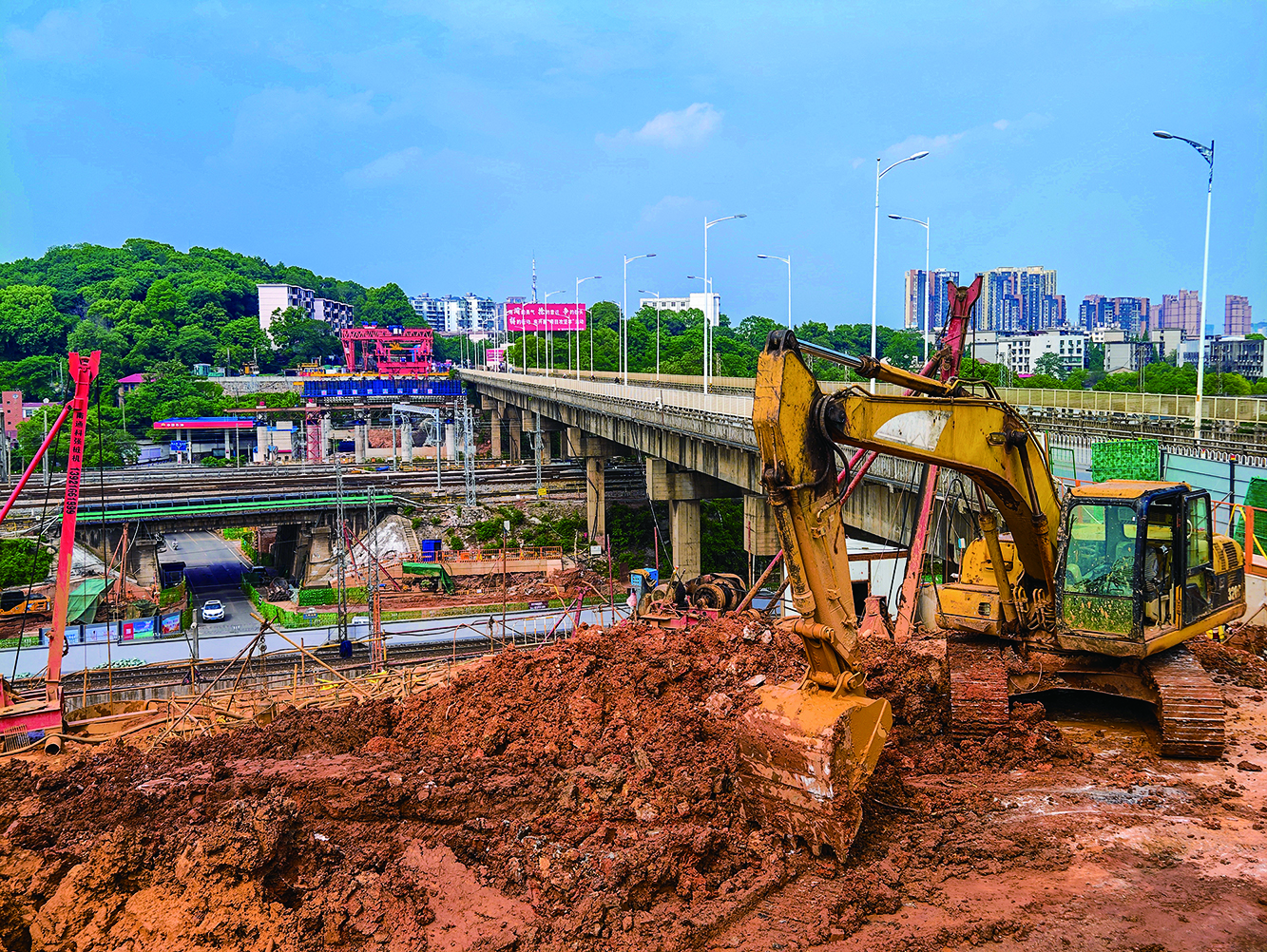 2023年5月12日,响田大桥西端,桥头接线工程施工场景。