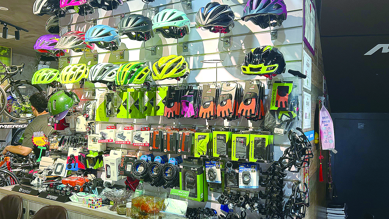 除了车,骑行服、护目镜等骑行装备也成了“重头戏”。为了满足消费者的需求,张保伟的门店还提供丰富的产品选择:“骑友们越来越注重骑行体验,对骑行服、头盔等装备也有较高要求。”