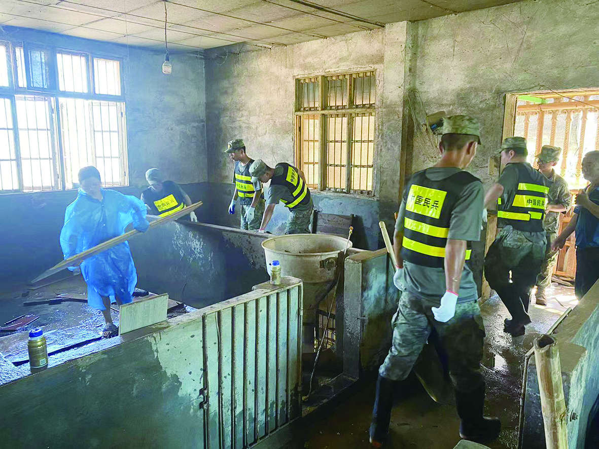 在湘潭县易俗河镇新湖村,四处可见厚厚的淤泥、被冲散的垃圾、死去的家禽尸体和被泡水的家具。三伏天里温度高,不少动物尸体出现了腐烂情况,如不及时处理则有形成瘟疫的危险。官兵和民兵们跟随洒水车、消防车,逐村逐栋帮助灾民冲刷房前屋后的淤泥,应急营战士忍住恶臭,对死亡家禽进行清理,随后配合当地疾控部门进行消杀。