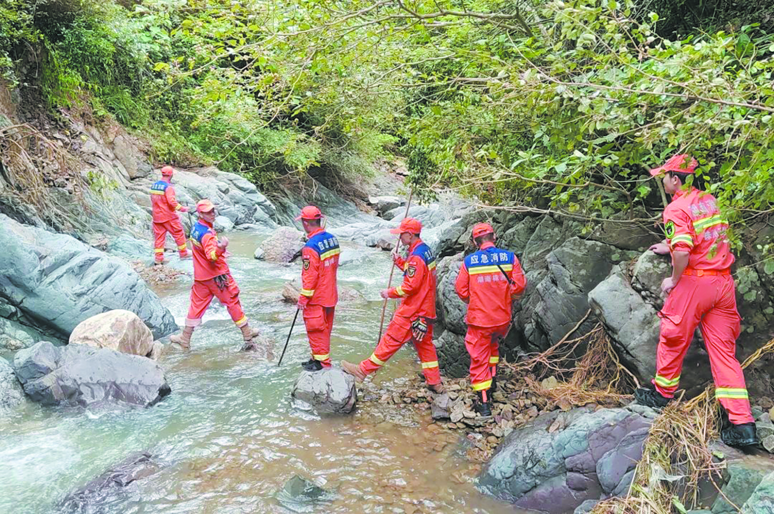 到达资兴后,株洲消防员们兵分两路,一路赶赴资兴市黄草镇雷公仙村开展搜救,另一路赶赴黄草镇长兴瑶族村开展搜救。由于山间沟深坡陡、道路狭窄,水流湍急,救援设备、车辆等进入困难,救援难度较大。但消防员们不畏艰险,根据现场情况制定搜救方案,全力以赴进行救援。