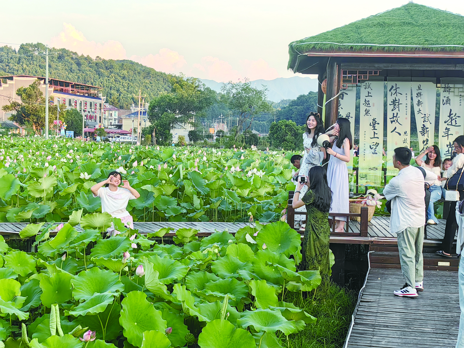 陆续赶来的游客,沿着新修的栈道,漫步莲池,赏花拍照。荷塘中央,几座凉亭挂满了李东阳等历史名人的诗句,一群身着汉服的美女和青年,撑着油纸伞,在莲叶花海中穿梭,宛如古时的文人墨客,悠然自得地品味着美景中的诗情画意。
