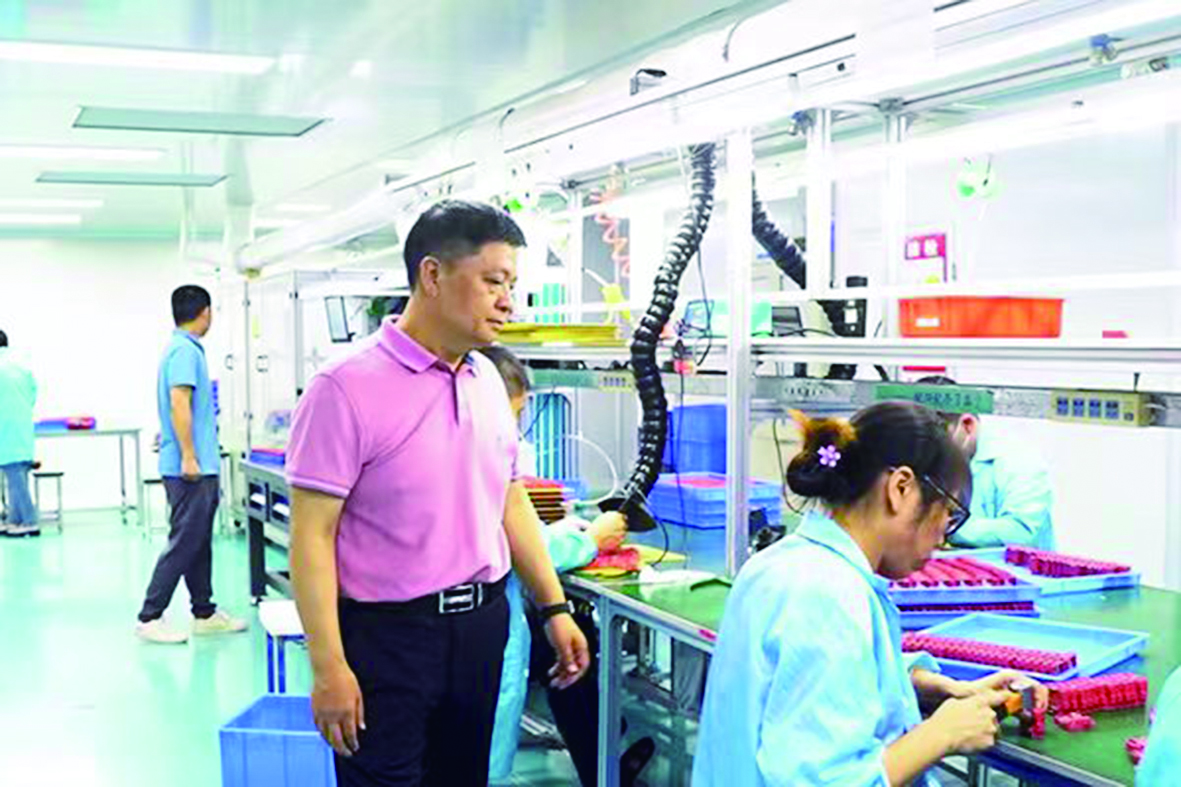 殷建云(左)下车间指导生产。 受访者供图