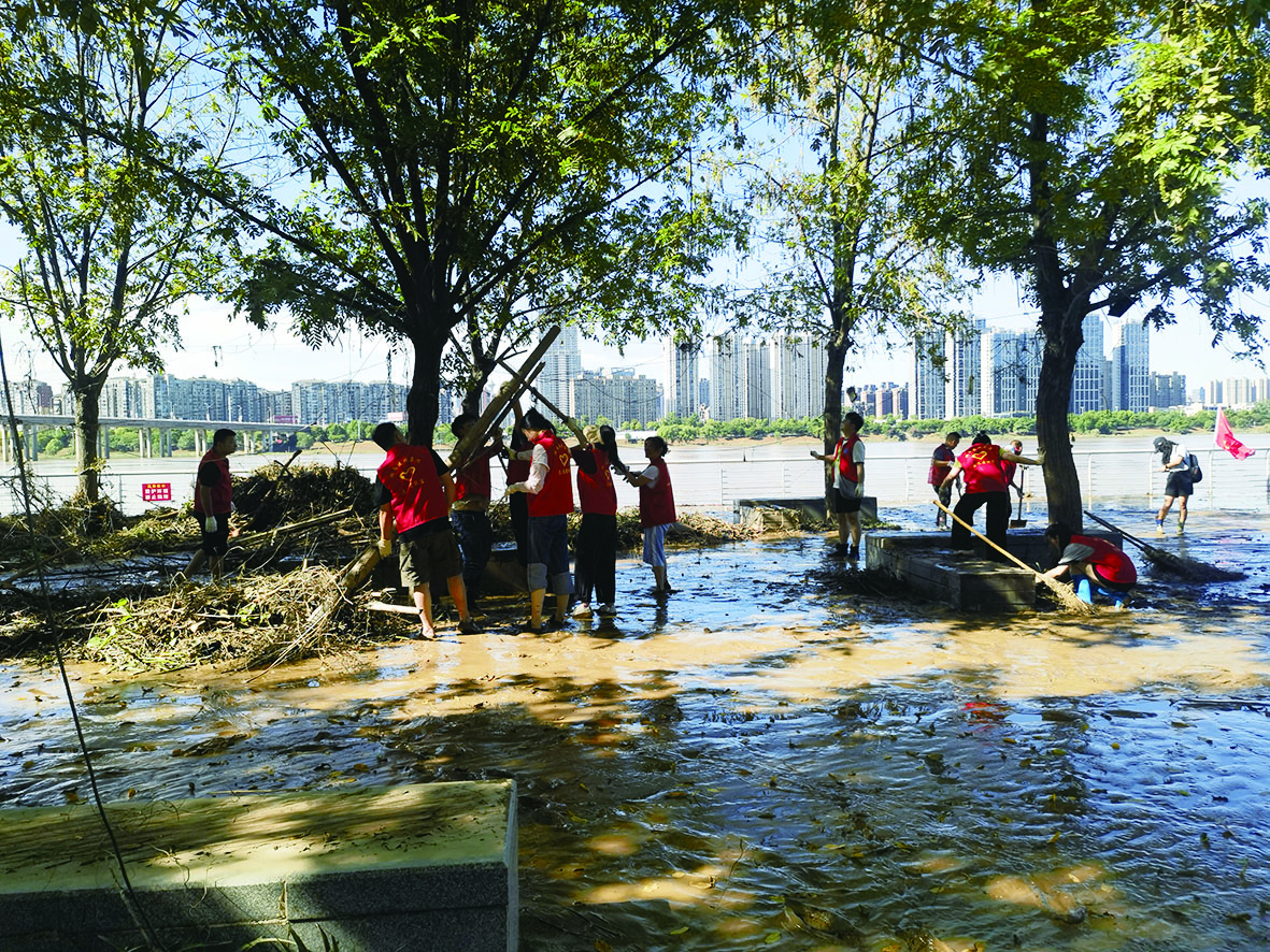 洪水渐渐消退后,被淹没区域一片狼藉,地面留有厚厚的淤泥,护栏、绿化树上挂有不少垃圾。6支志愿服务队不约而同上阵,他们的身影遍及清淤现场。