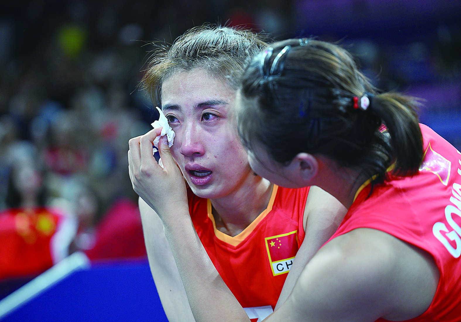 赛后,中国队员们表情凝重地通过混采区,不少人双眼已哭红。面对记者,她们只能无言地挥手拒绝。在多数队员已经通过数分钟后,李盈莹才低着头走来,看得出她在竭力控制自己的表情,喘口气平复了心情,她终于站定在麦克风前。