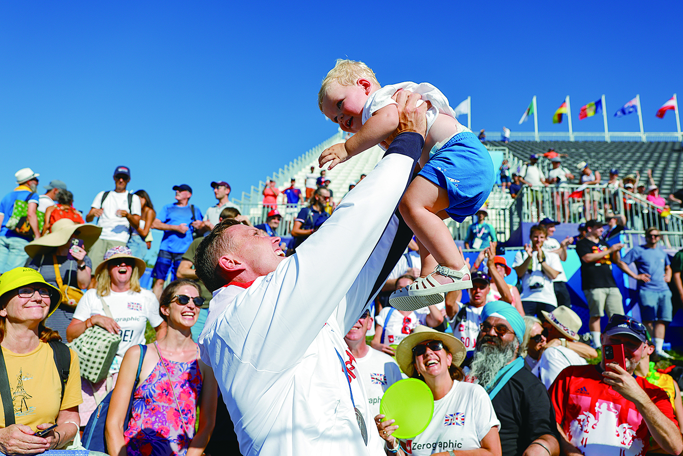 8月5日,亚军英国选手克拉克(前左)在比赛后和自己的孩子互动。当日,巴黎奥运会皮划艇激流回旋男子极限皮艇决赛在马恩河畔韦尔水上体育场举行。新西兰选手布彻夺得冠军,英国选手克拉克和德国选手黑格分获亚军、季军。 新华社记者 沈伯韩 摄