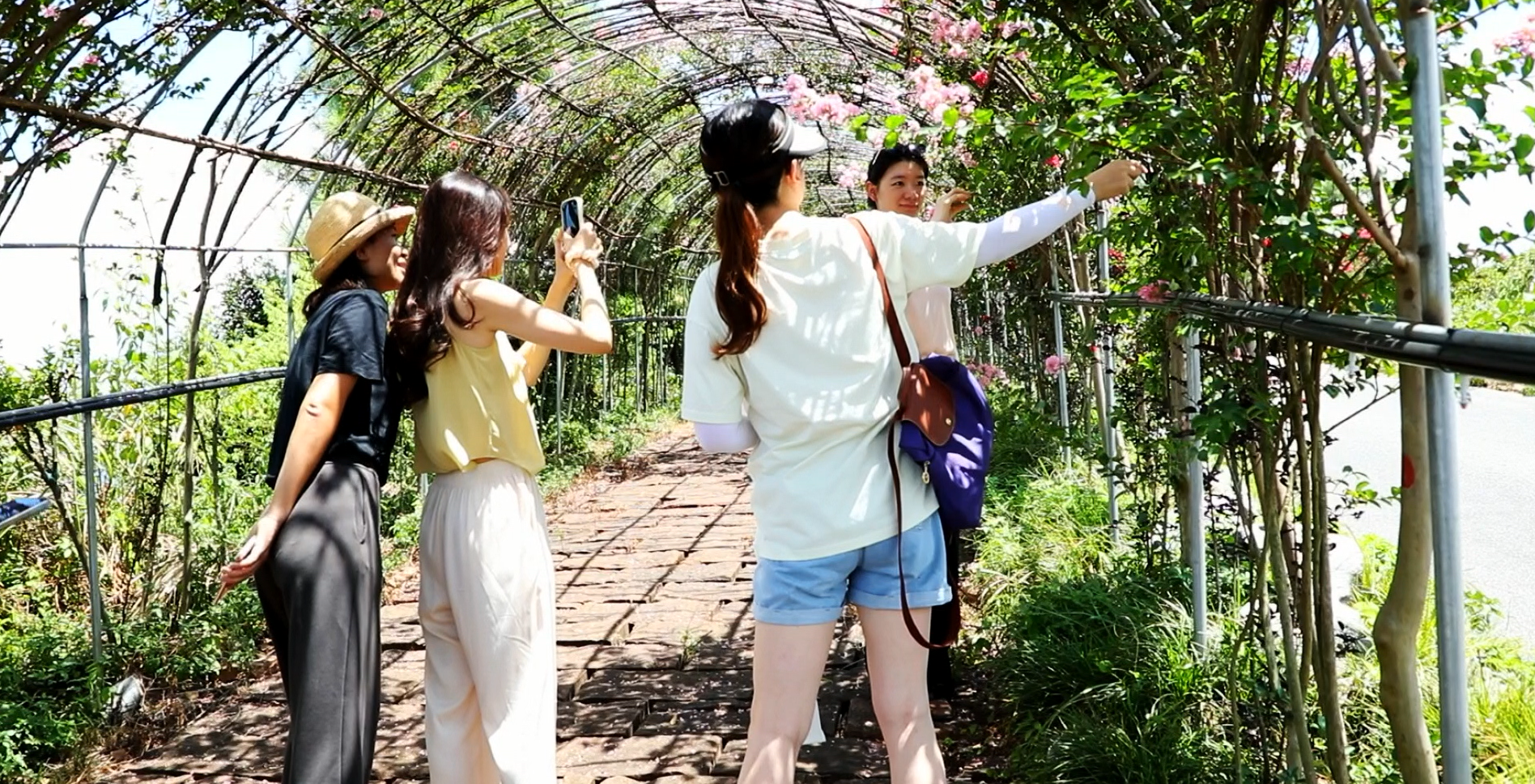 走进中国花湖谷景区紫薇园,只见110万株“丹红”“赤红”“粉黛红”等各色紫薇花绽放枝头,绚烂如画。轻风拂过,玫红、大红、雪白的花束垂挂摇摆,显得生机勃勃。不少游客,穿梭在由紫薇花组成的长廊里,或驻足欣赏,或拍照留恋,欢声笑语不断。