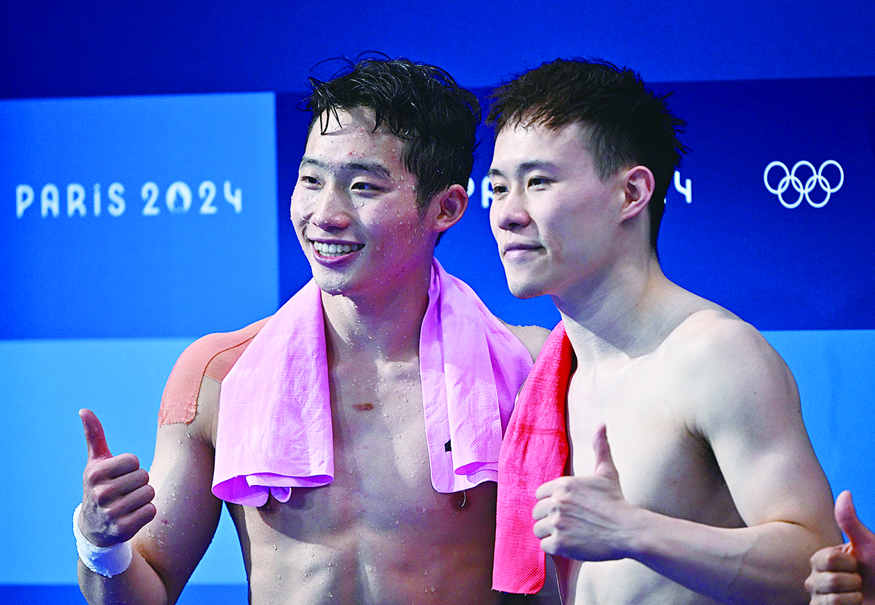 8月8日,谢思埸(右)、王宗源在赛后庆祝。 新华社记者 王鹏 摄
