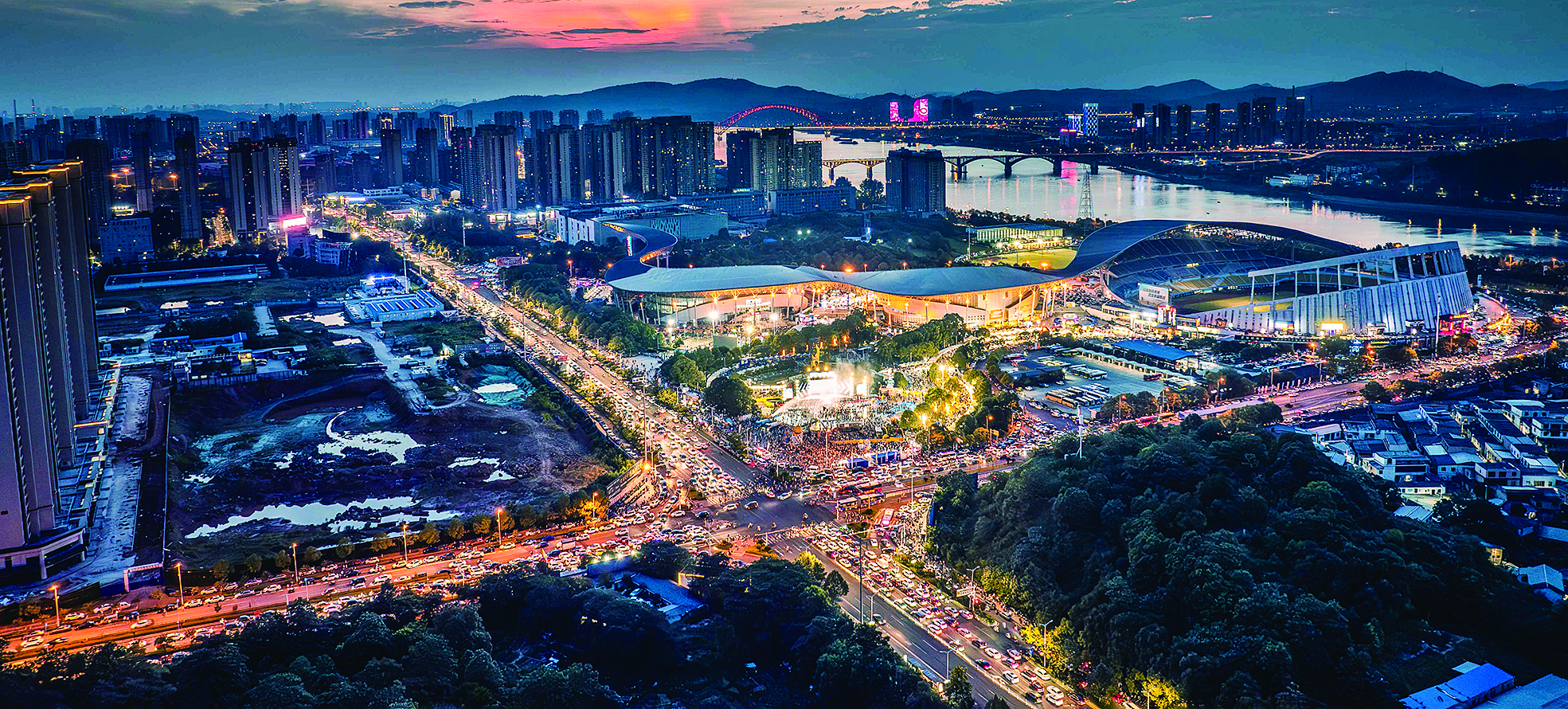 灯火辉煌的“厂BA”现场与晚霞交相辉映。 罗金星 摄