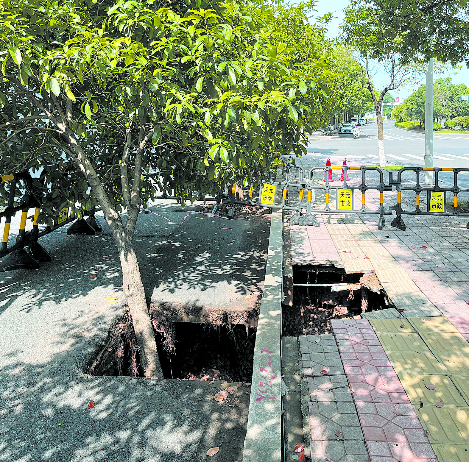 人行道上,地面塌陷。 记者/刘平 摄