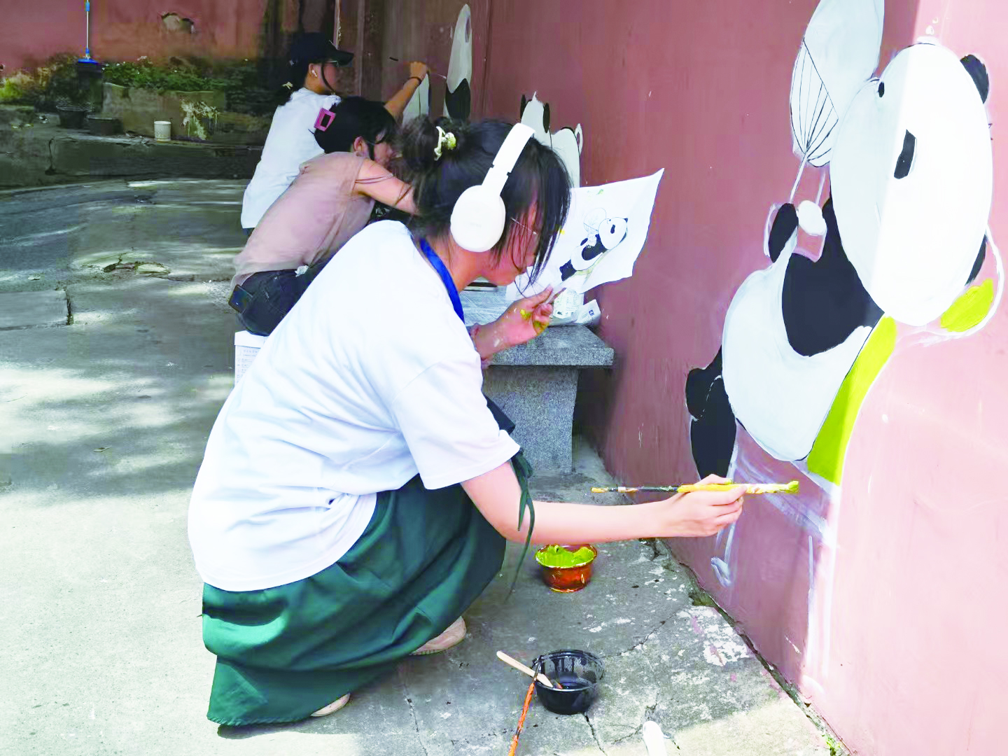 猫和老鼠的嬉戏场景,在志愿者的笔下活灵活现,它们或跳跃、或依偎,展现了一种跨越物种的纯真与和谐。而功夫熊猫的形象则更为传神,它们或打坐冥想,或挥拳展示武术魅力。尤为引人注目的是那些立体熊猫的绘制,它们栩栩如生,仿佛随时都能从墙面跳出,与过往行人进行一场跨越次元的亲密互动,让人赞叹不已。