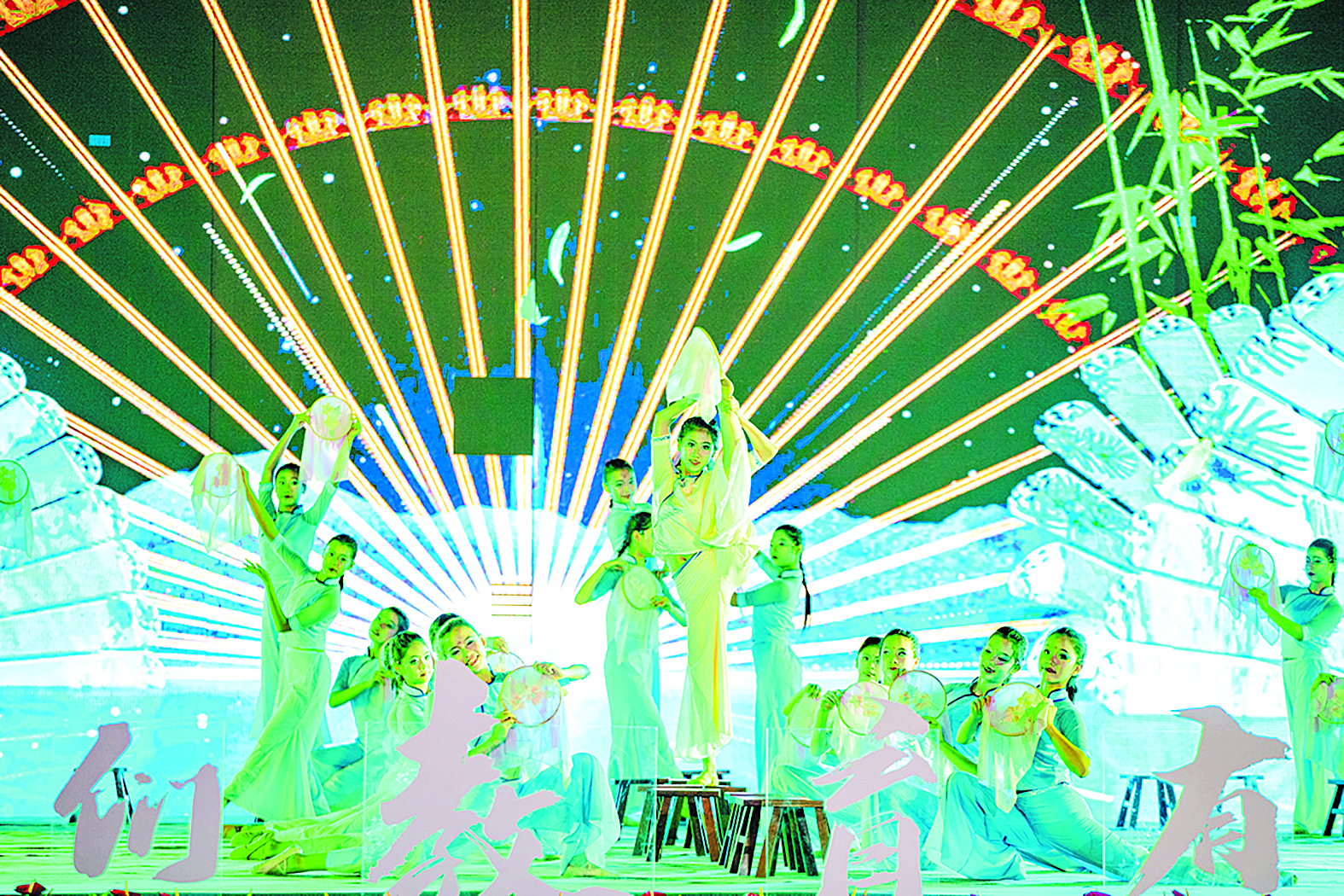 舞动青春,展现株洲学子的时代风貌。8月14日晚,2024年“咱们教育有力量”株洲市第八届中小学生艺术展演舞蹈专场演出在神农湖水秀广场举行。舞蹈专场由全市16所学校精心推选的节目组成,形式与风格精彩多样。场面宏伟、气势浩大、制作精良,既有对现代舞的精彩演绎,又有民俗、异域风情舞的多样呈现,将艺术的魅力展现得淋漓尽致。图为市二中枫溪学校初中部表演的舞蹈《绣舞翩跹》。