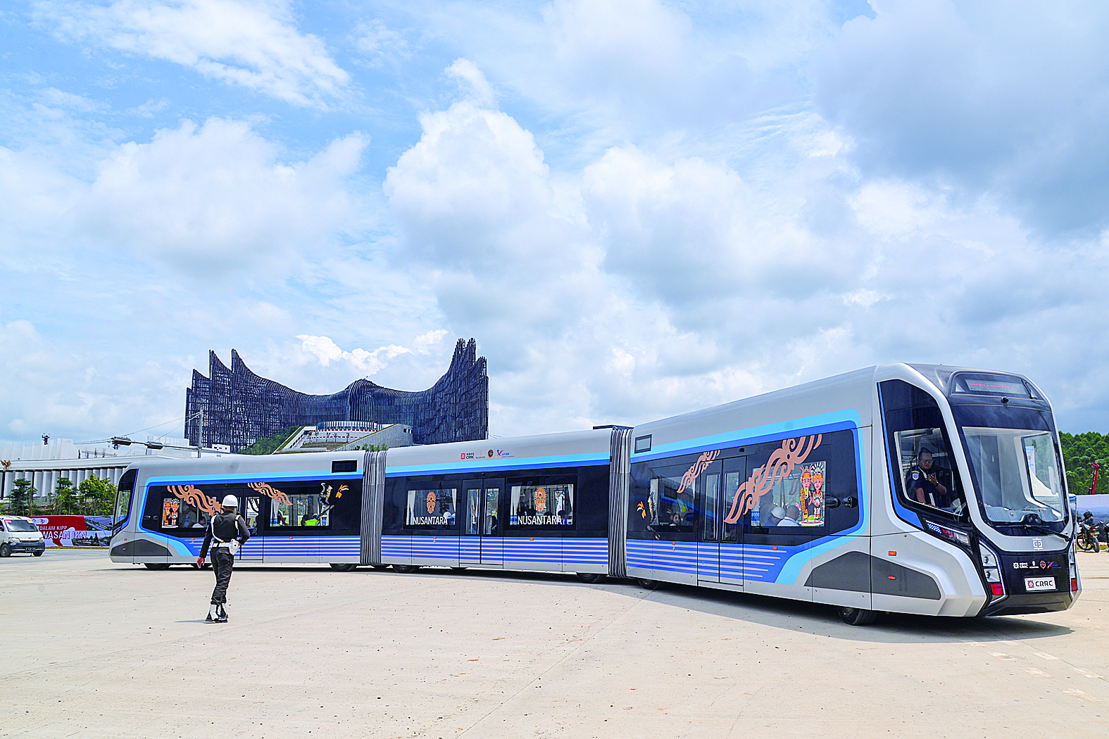 图为8月12日在印度尼西亚新首都努山塔拉拍摄的智轨系统。