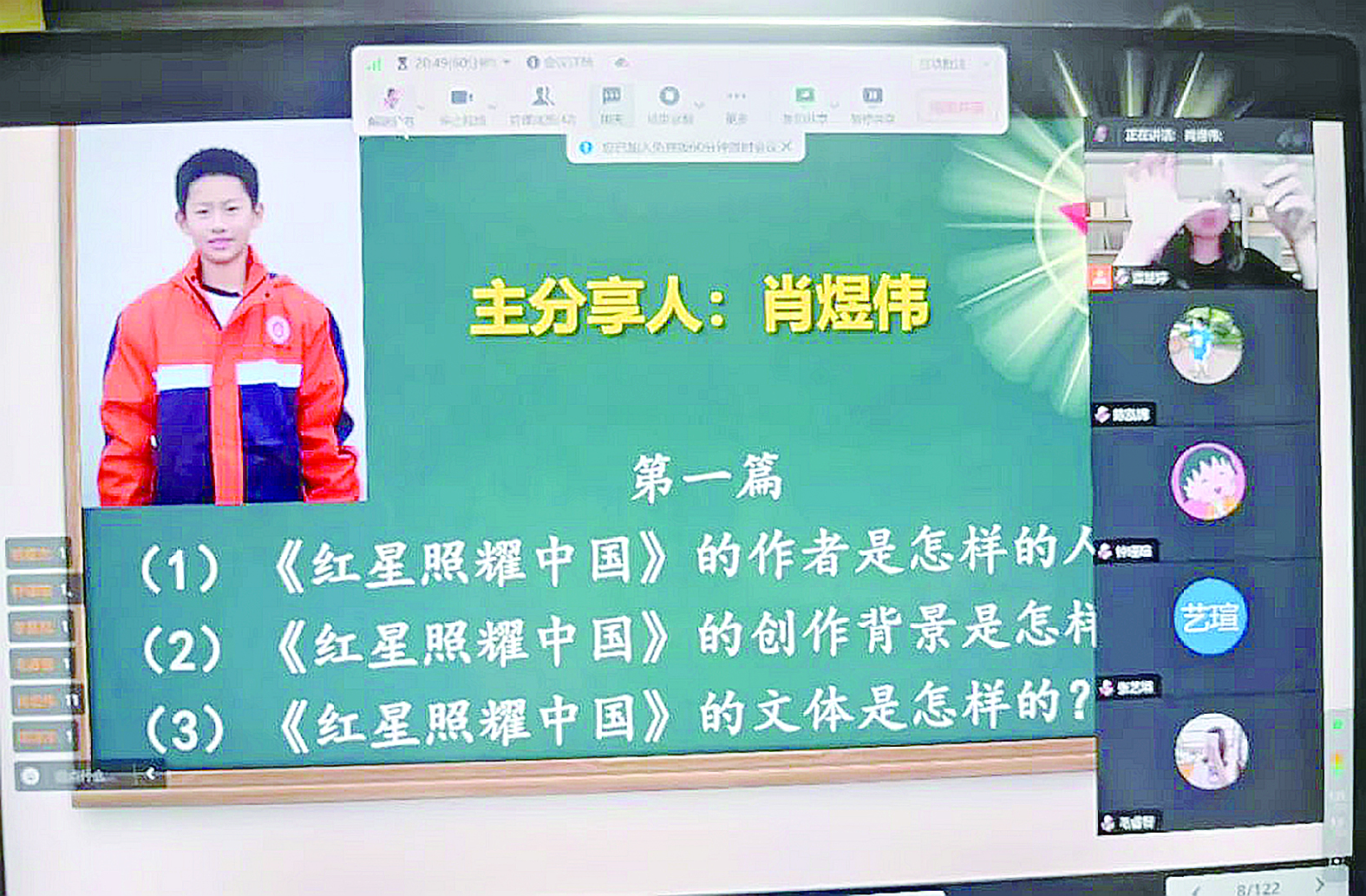 语文教师刘萍萍说,通过线上阅读分享会,发现同学们对《红星照耀中国》一书的阅读有难度。但是通过学生们的自主分享,能够利用思维导图、时间线索轴等,帮助学生更好地理清思路。在下个学期可带领同学们观看影视片段,改编剧本等课堂形式,增强学生阅读兴趣,感知文章中出现的人物形象,增强爱国热情和责任感。