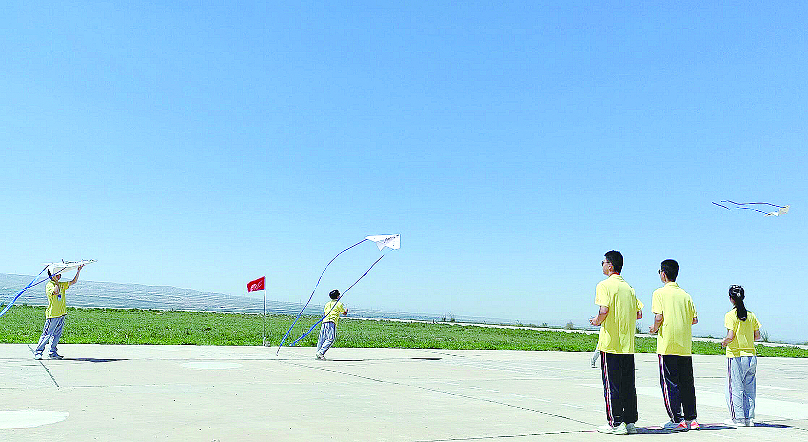 同学们在烈日下放飞纸飞机。 通讯员供图