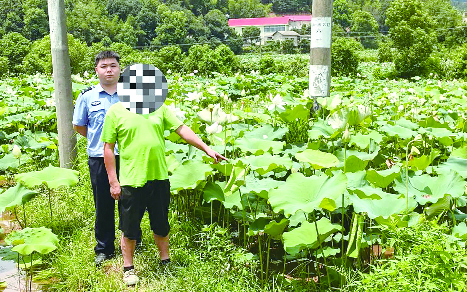 落网的刘某某指认盗窃莲蓬现场。 通讯员供图