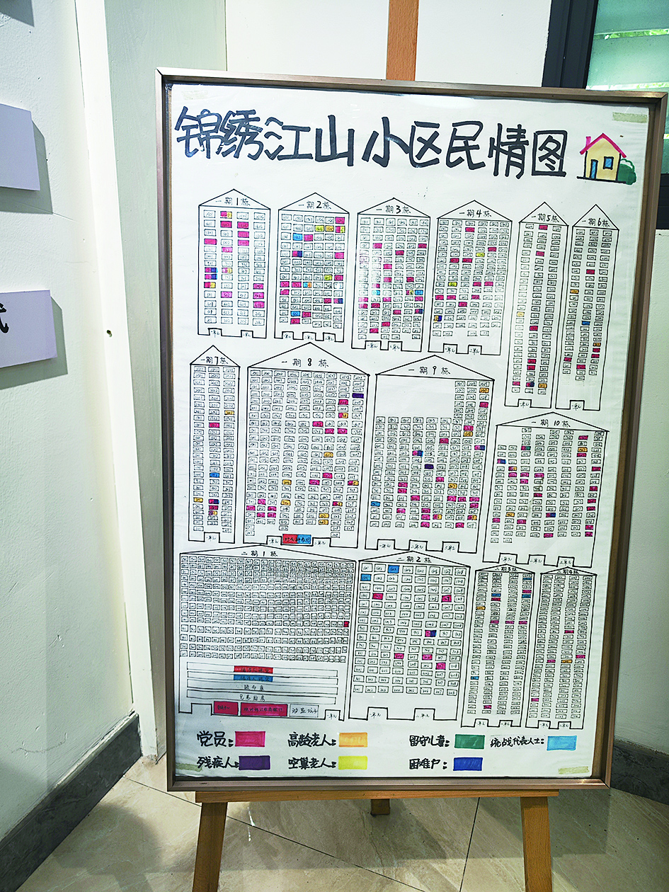 锦绣江山小区是一个由14栋住宅楼构成的温馨家园,居住着3875户家庭,其中支部党员35人,在职党员174人,统战代表人士53人……这些曾经散落于各类台账与文件夹中的“大数据”,如今在一张精心手绘的小区民情图上焕发生机。