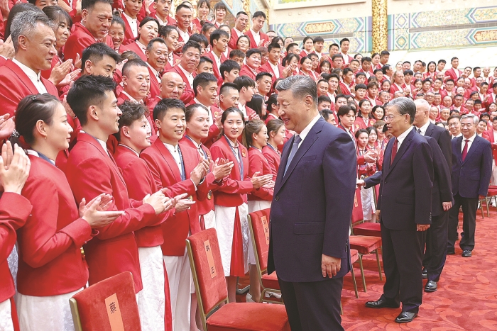 8月20日,党和国家领导人习近平、赵乐际、王沪宁、蔡奇、李希、韩正等在人民大会堂接见第33届夏季奥林匹克运动会中国体育代表团全体成员。 新华社记者 鞠鹏 摄