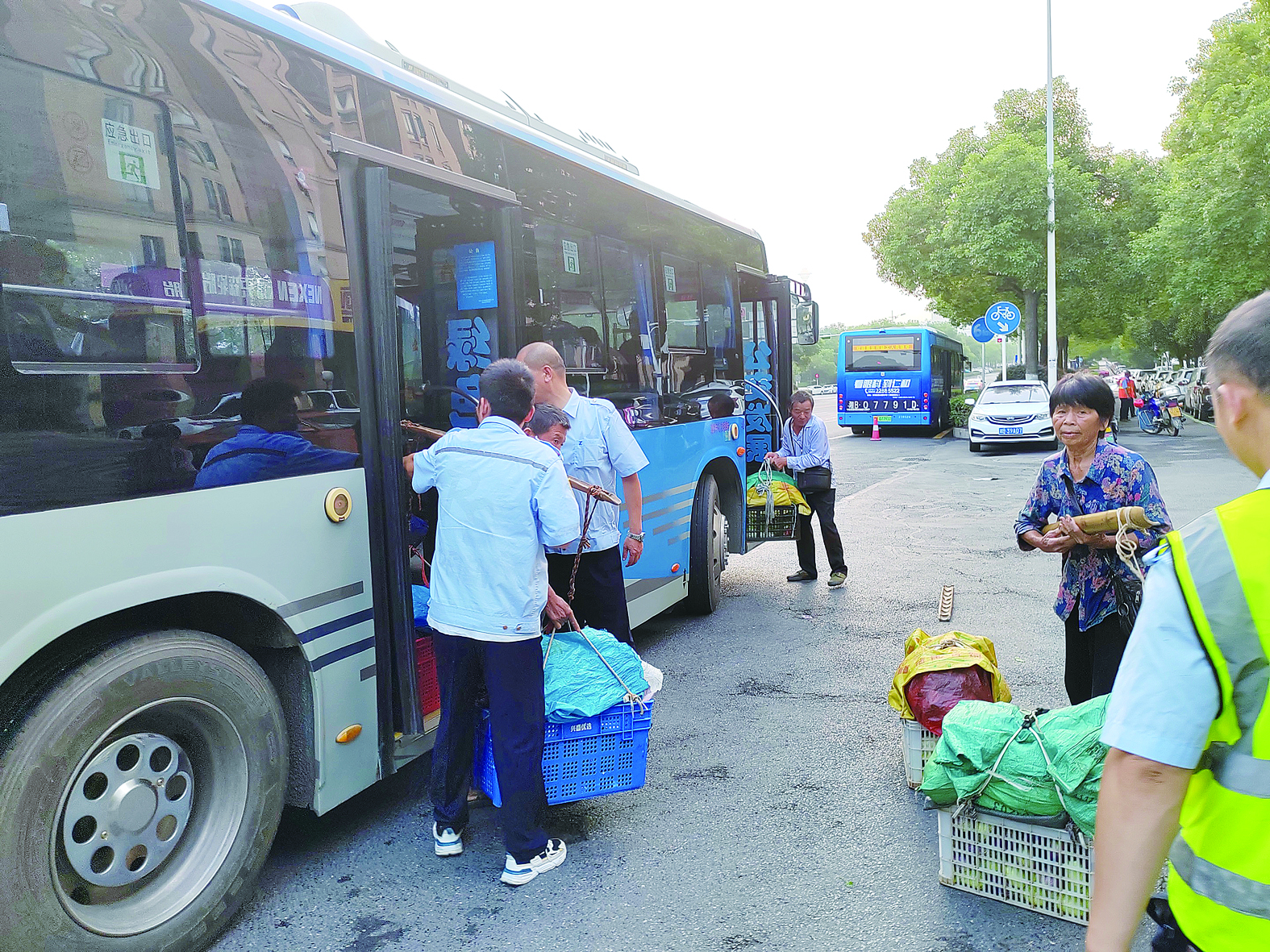 公交农产品专线将菜农送到农贸市场附近。通讯员/殷滋 供图