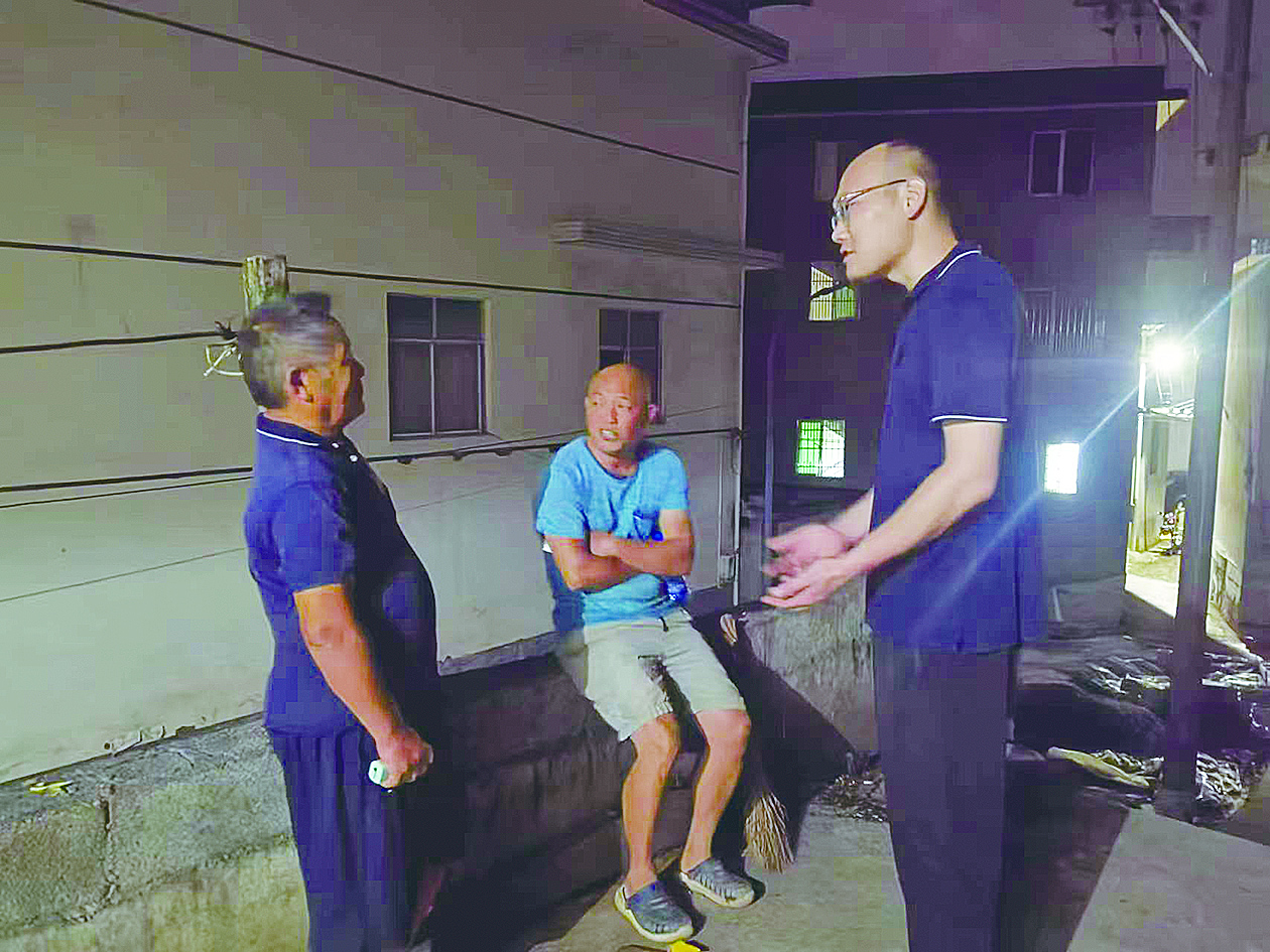 楚鸿玮(右)深夜走访群众。 通讯员 供图