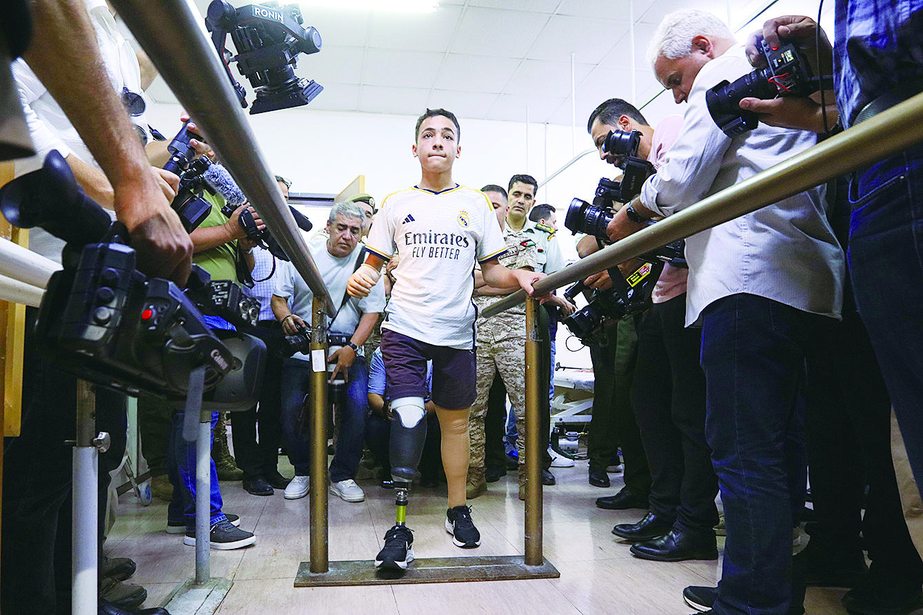 图为26日在约旦首都安曼侯赛因医学城,一名在巴以冲突中失去一条手臂和双腿的男孩安上假肢后练习走路。 新华社发(穆罕默德·阿布·古什 摄)