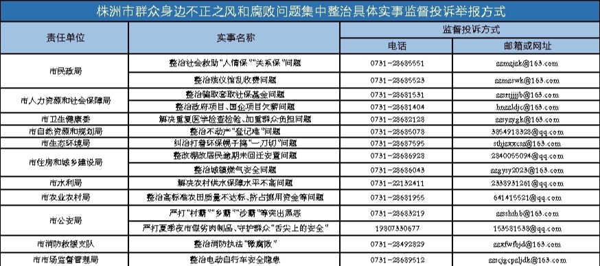 株洲日报讯(全媒体记者/陈正明) 8月28日,市群众身边不正之风和腐败问题集中整治领导小组办公室公布了我市具体实事监督投诉举报方式。