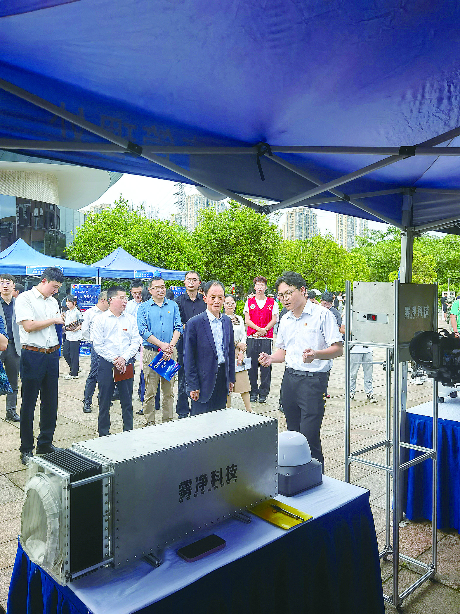 侯添木(右一)正向刘友梅院士介绍产品性能。 记者/陈驰 摄