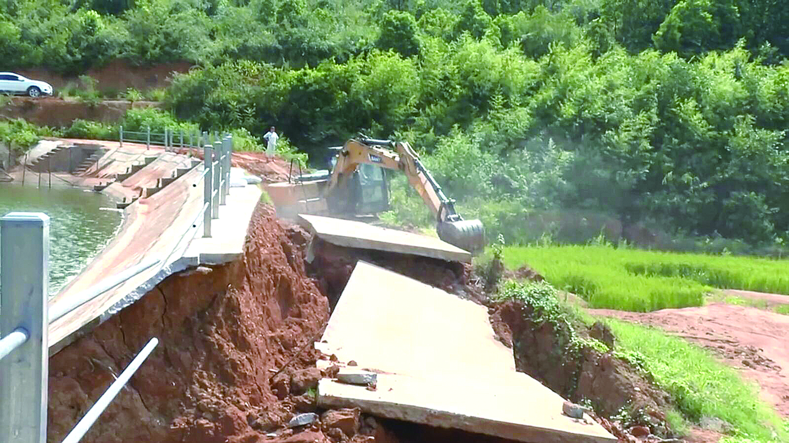 黄竹村文家组的炎王塘在这次强降雨过程中发生垮塌,缺口长达5米、宽2.5米,塘堤底部因大水冲刷出现镂空。灾情发生后,文家组主动和镇村两级对接,并召开组民大会,商讨修缮事宜。最终组上自筹资金6000元,采购了卵石、沙子,镇政府提供水泥、片石,通过60多个工人作业和挖机作业,目前已完成修缮。