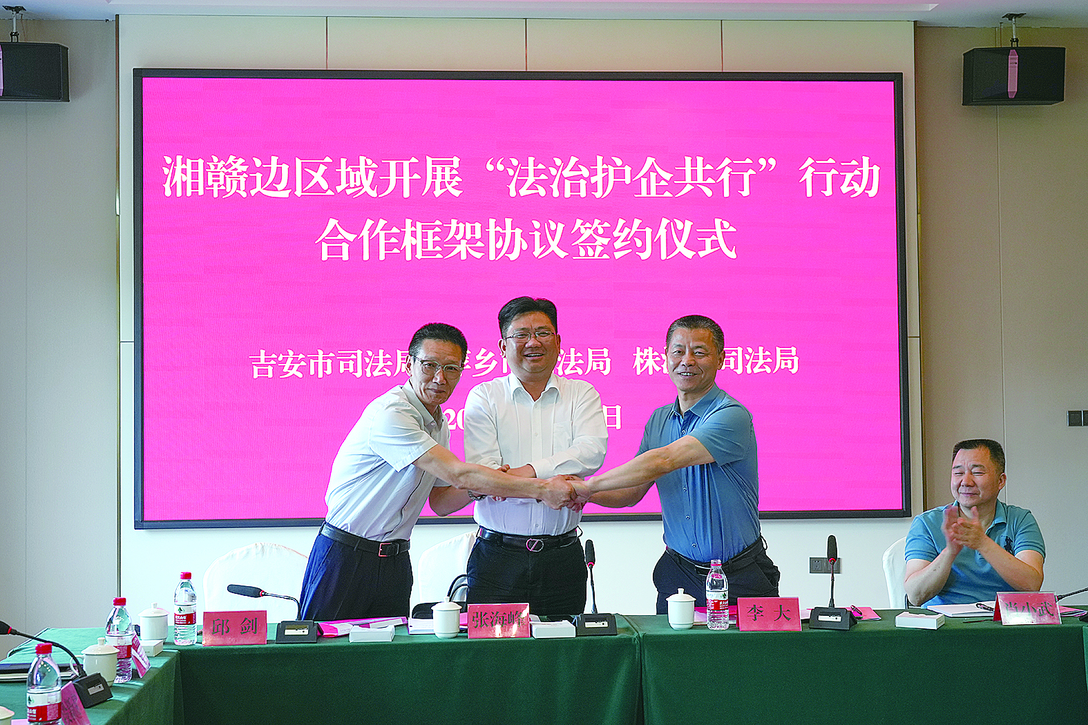 5月17日,吉安、萍乡、株洲三地司法行政机关共同签订《吉安市萍乡市株洲市湘赣边区域开展“法治护企共行”行动合作框架协议》。 通讯员供图