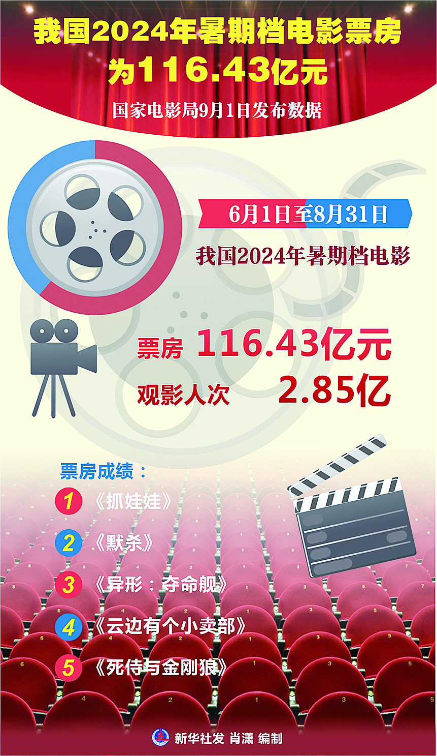 据新华社北京9月1日电 国家电影局1日发布数据,2024年6月1日至8月31日,我国暑期档电影票房为116.43亿元,观影人次为2.85亿;国产影片票房为84.81亿元,占比为72.84%。其中,《抓娃娃》《默杀》《异形:夺命舰》《云边有个小卖部》《死侍与金刚狼》位列暑期档票房榜前五位。