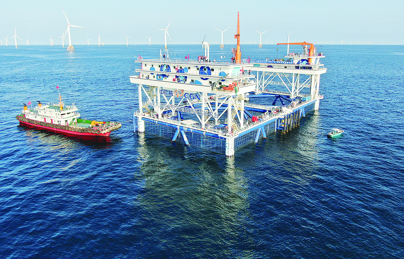 图为9月2日拍摄的中广核“伏羲一号”风渔融合网箱平台。