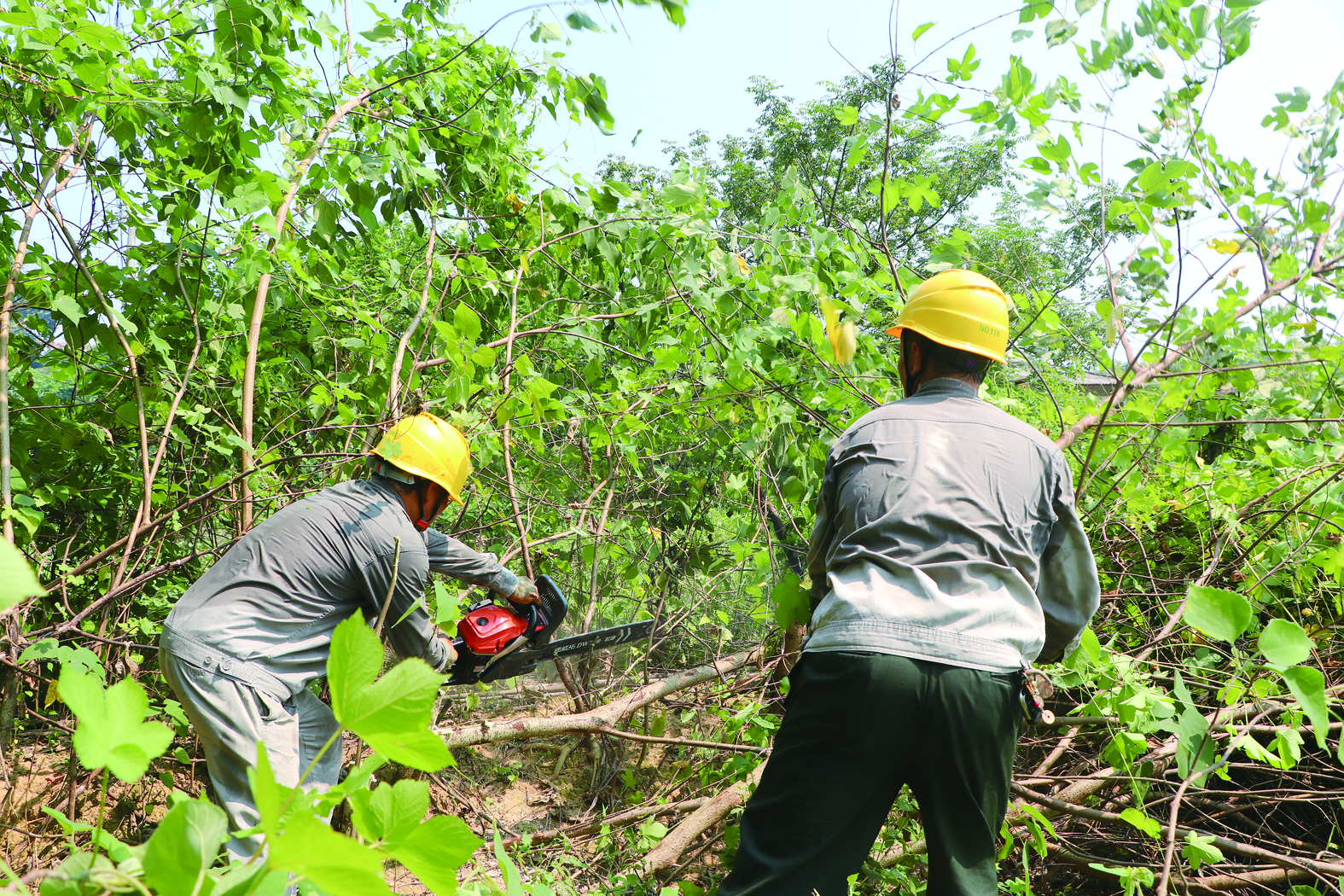 刘仕清上半身已经湿透,从梯子上下来的他顾不上休息,拎着油锯又走向另一片灌木丛,“先把这里的活干完,中午回所里再换一套。”