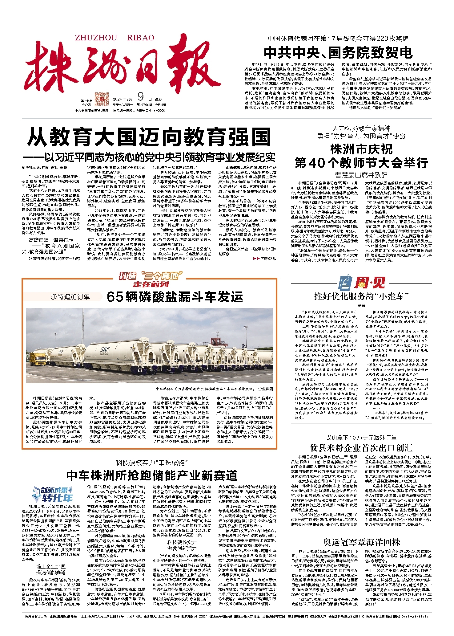 新华社电 9月8日,中共中央、国务院向第17届残奥会中国体育代表团致贺电,祝贺我国残疾人运动员在第17届夏季残疾人奥林匹克运动会上取得94枚金牌、76枚银牌、50枚铜牌的优异成绩,实现了比赛成绩和精神文明双丰收,为祖国和人民赢得了荣誉。